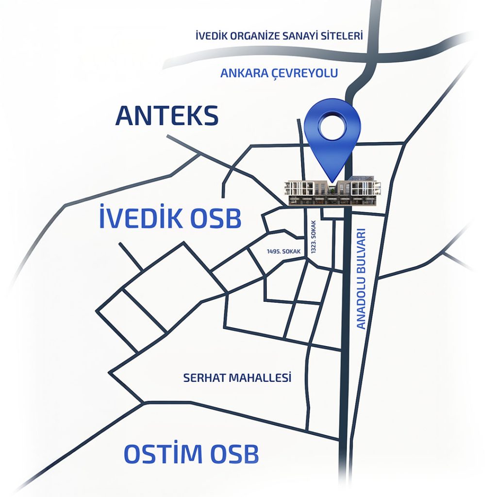 İki ana cadde arasında yükselen Central İvedik, Ankara’nın en güçlü ticaret akslarından birinde yer alıyor. İvedik OSB’nin merkezindeki proje, Anadolu Bulvarı ve ana ulaşım arterlerine yakınlığıyla hem çalışanlara hem de iş ortaklarına kolay erişim sağlıyor. Bu avantajlı lokasyon, şehiriçi ve şehir dışı ticaret bağlantılarında güçlü bir değer yaratıyor. Yatay mimarinin ferahlığı ve modern iç bahçelerle birleşen tasarım, çalışanlara konforlu bir ortam, ziyaretçilere ise güven veren bir ticaret atmosferi sunuyor. Central İvedik, konumuyla iş yaşamına stratejik bir ayrıcalık katıyor.